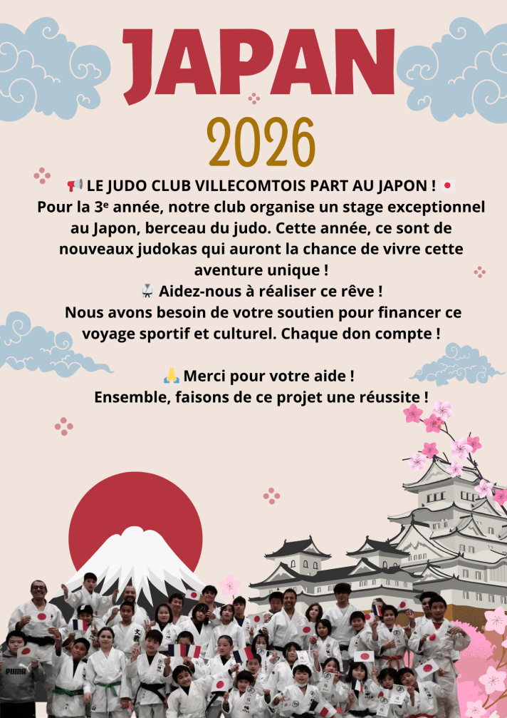 | Vendredi 19 Décembre de 17h à 21h Salle tennis de table | Départ Japon du 24 au 06 mars 2026 | Vous appréciez notre Club de judo ? bénévolat, partenariat, sponsoring ou mécénat, de nombreuses possibilités s’offrent à vous 🤝 Nos partenaires |