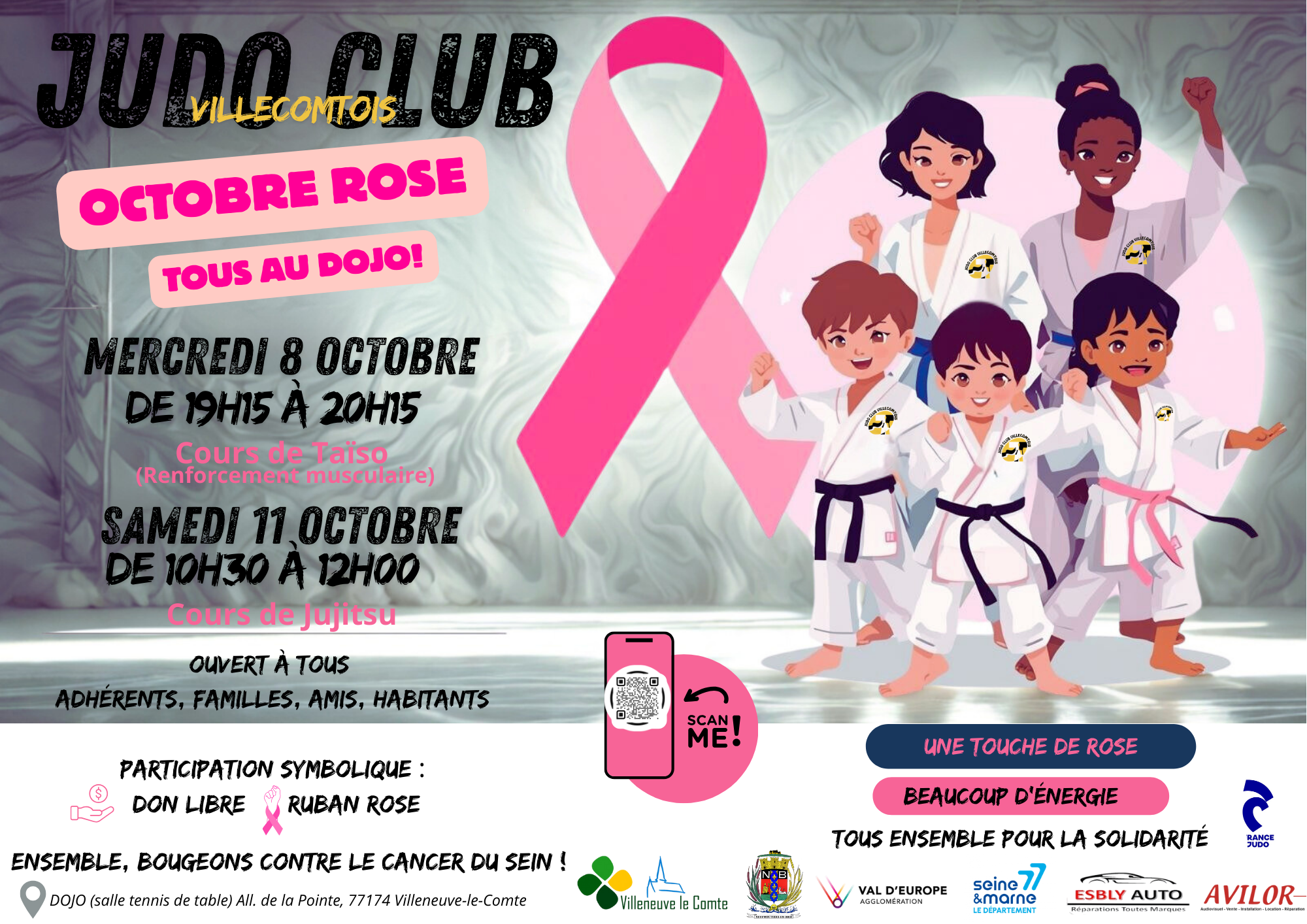 Le dojo s’est paré de rose pour soutenir la lutte contre le cancer du sein, mais aussi pour rendre hommage aux familles touchées par la perte d’un bébé à la naissance. Le cours, ouvert à tous et toutes, a réuni nos adhérents ainsi que des participants extérieurs, venus partager un moment sportif, humain et solidaire.